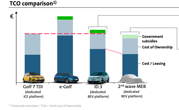 С электромобилями Volkswagen второй волны, которые сделаны на собственной платформе MEB, картина ожидается другая - их TCO будет не выше, чем у машин с ДВС. Да, они останутся чуть дороже при покупке, но эта разница легко отобьется госсубсидиями.