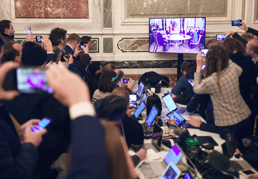 Прибытие Зеленского вызвало ажиотаж у журналистов, его засыпали вопросами, впрочем, оставшимися без ответа. Спрашивали, последует ли он примеру Макрона и приедет ли в Москву на юбилей Победы, и еще - что он будет считать успехом саммита "нормандской четверки". Во время приезда Меркель тоже просили - но о другом, попозировать для фотокамер. Журналистов, кстати, было несколько сотен, и не все из них успели вовремя попасть во дворец к приезду лидеров. Зато к началу саммита в пресс-центре были, по всей видимости, все желающие из числа аккредитованных - как говорится, яблоку было негде упасть.