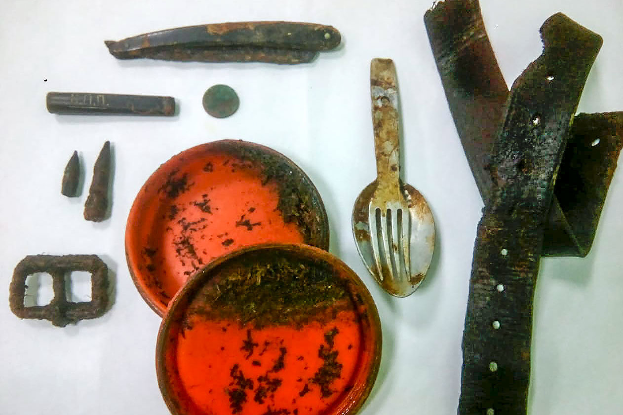 15.25, Наталья: Ложка-вилка, маргаринница с табаком, два подсумка немецких с нашими патронами, бритва...