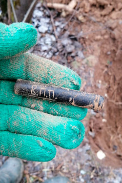 Это под его рукой оказалась главная находка - черный эбонитовый пенал с пергаментным вкладышем, на котором смогли распознать имя погибшего и адрес жены.