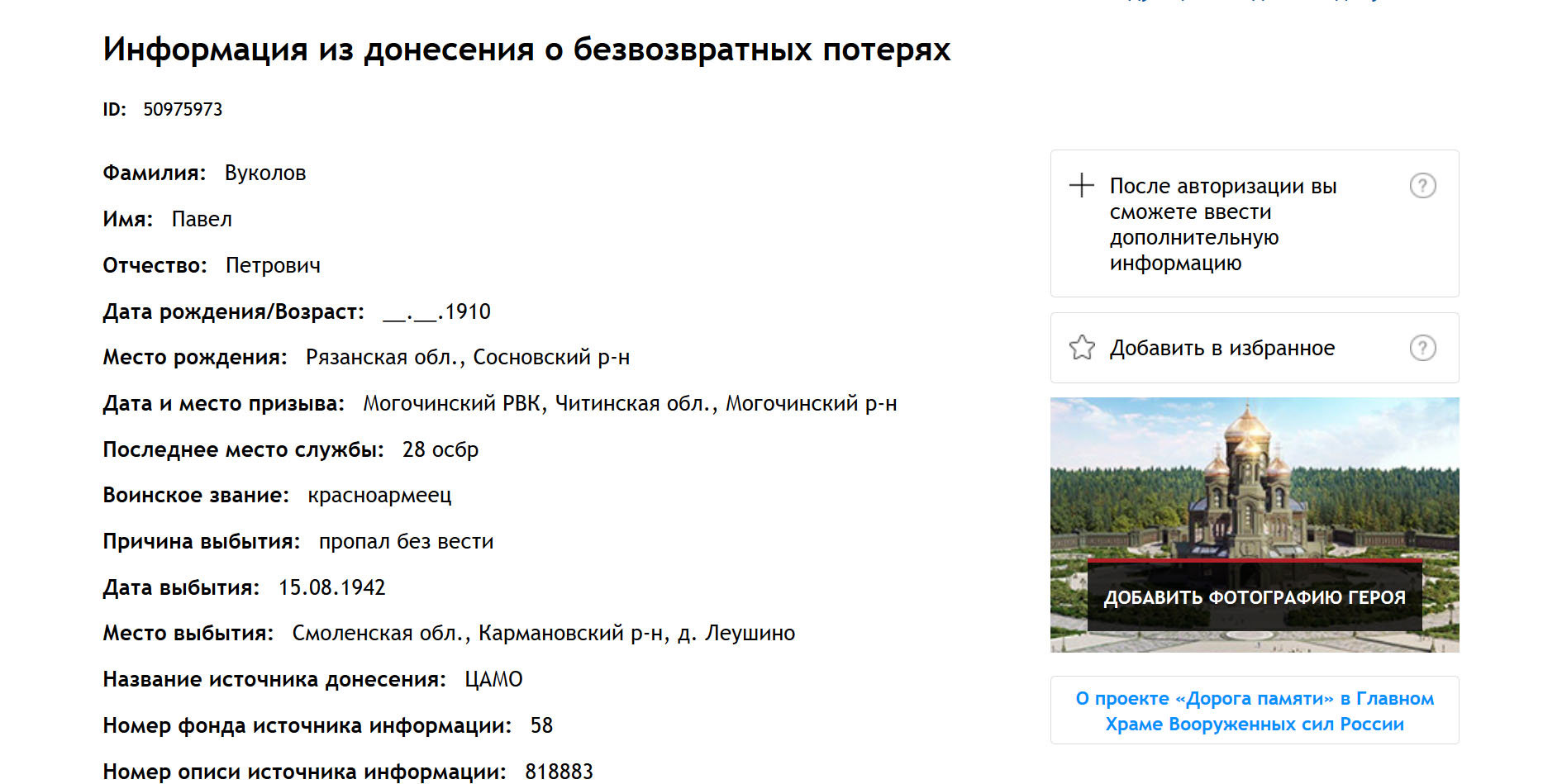 "Здравствуйте! Срочно нужны ваши помощь и содействие. Вчера, 1 декабря 2019 года, поисковой группой "Рейд" (командир - Лукашов Руслан Витальевич) в Гагаринском районе Смоленской области, в урочище Леушино, обнаружен и опознан по записке в медальоне боец 28-й отдельной стрелковой бригады Вуколов Павел Петрович, 1910 года рождения (место - Сосновский р-н Рязанской области). Призван в РККА Могочинским РВК Читинской области. В донесении о потерях указан адрес жены: Татьяна Андреевна, с. Чалдонка, Могoчинский район Читинской области. Факт его ухода на фронт из вашего района подтверждается в Книге памяти Читинской области. Убедительно просим принять все возможные меры по розыску родных и близких погибшего бойца" (указали адрес электронной почты и мобильный телефон).
