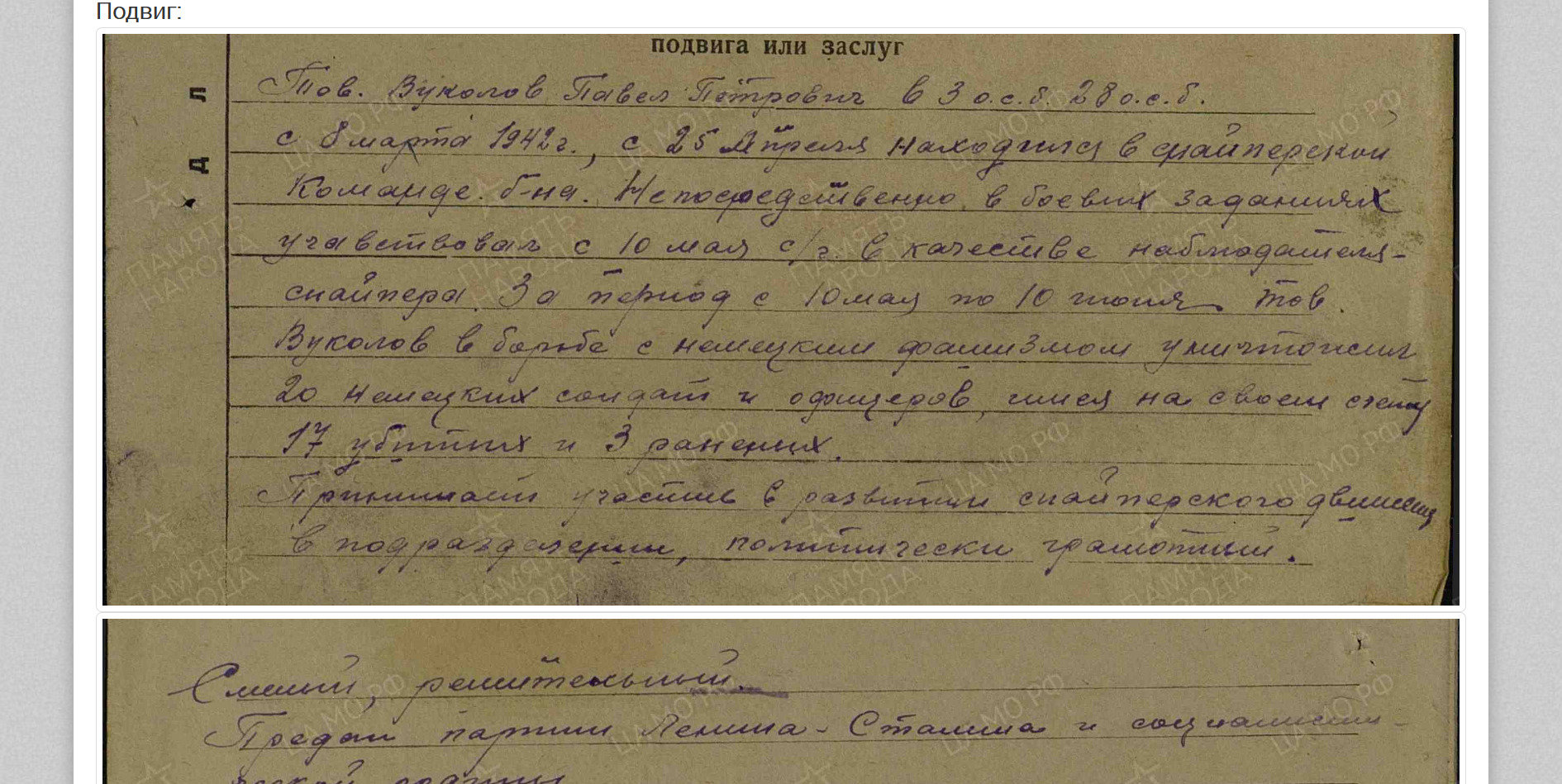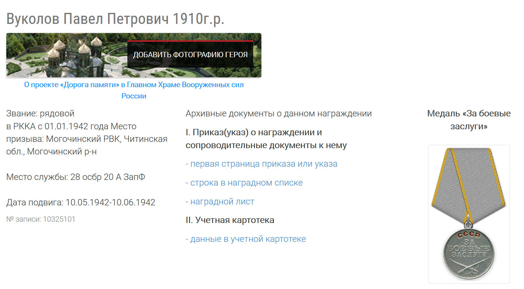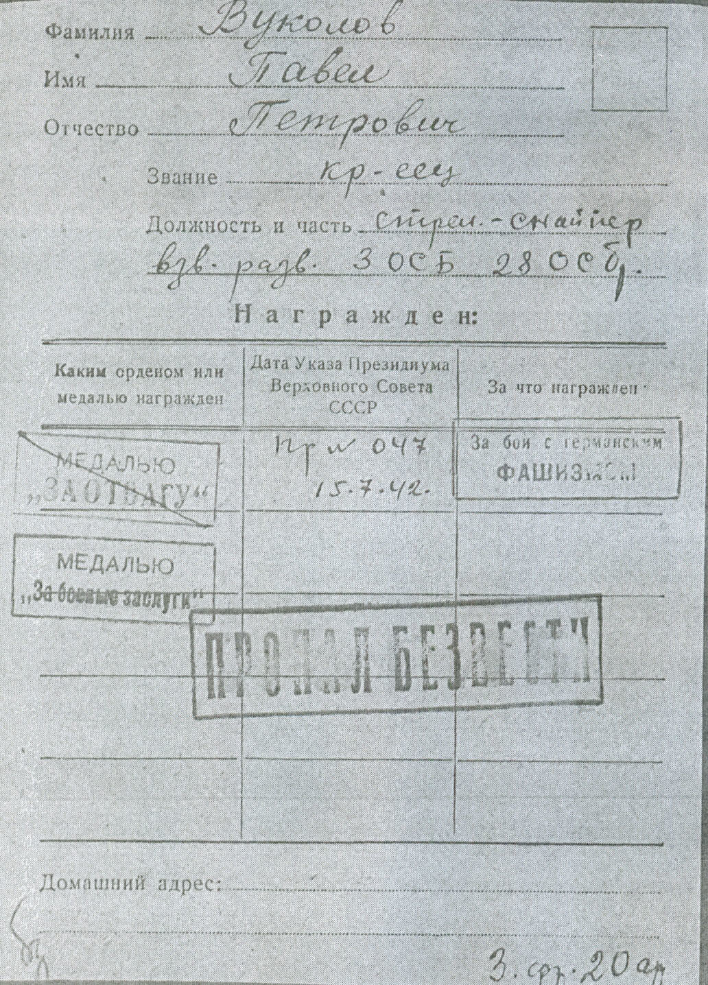 19.45 - из Москвы в ЦАМО по электронной почте: "Поисковой группой "Рейд" обнаружен и опознан по записке в медальоне боец 28-й отдельной стрелковой бригады Вуколов Павел Петрович, 1910 года рождения. Имеются сведения о награждении Вуколова П.П. медалью "За боевые заслуги". Приказ подписан 15 июля 1942 года, донесение о пропавшем без вести Вуколове П.П. - 18 августа того же года. Вполне возможно, что награду он получить не успел. Просим помочь в поиске ответа на этот вопрос. В селе Чалдонка Могочинского района Читинской области нашелся внук - Вуколов Иван Геннадьевич... Если награда не вручена, известим родных".