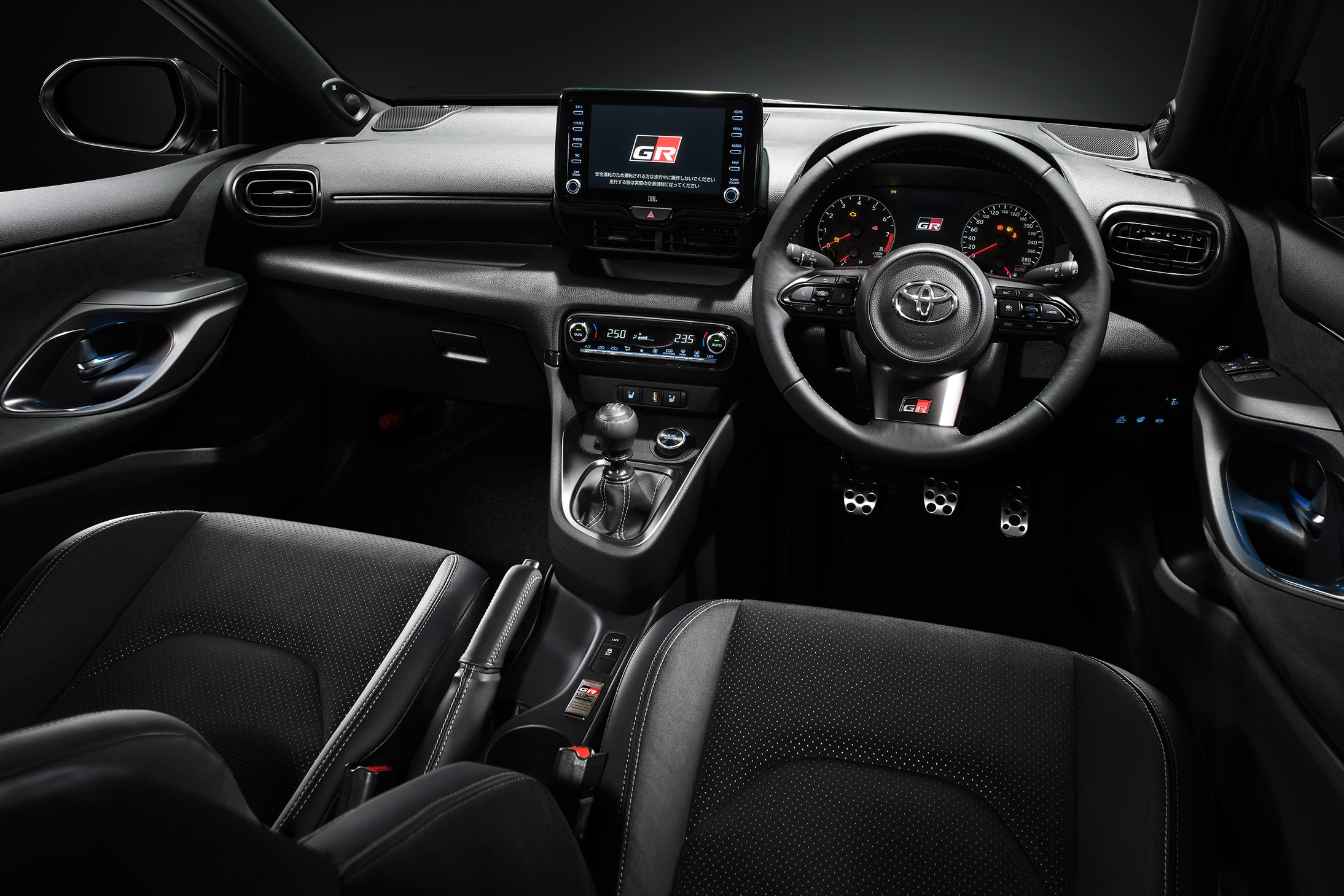 При всем GR Yaris не сугубо спортивный инструмент, а богато оборудованный хэтчбек: позади два полноценных места для пассажиров и багажник, на борту двухзонный климат-контроль, круиз-контроль, мультимедиа с тачскрином и синхронизацией со смартфоном, акустика JBL, подогрев сидений и руля, амбиентная подсветка салона и системы распознавания пешеходов и аварийного торможения