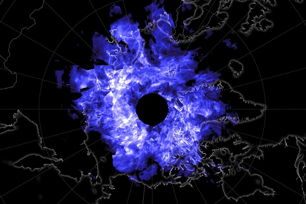 Фотография показывает вид со спутника на серебристые облака, которые нависли над Северным полюсом 12 июня 2019 года. Серебристые (также известны как ночные светящиеся облака) облака - редкое атмосферное явление, которое возникает в сумерках в летнее время года. Цвет облаков изменяется в зависимости от плотности частиц льда в воздухе - от светло-голубого до белого. Ученые обнаружили, что серебристые облака все чаще тянутся к более низким широтам, предполагается, что это результат изменений в атмосфере, вызванный климатической ситуацией.