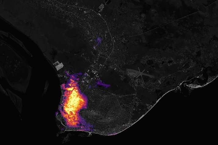 В марте 2019 года тропический циклон Идай пронесся через юго-восточную Африку и стал один из самых смертоносных штормов, зарегистрированных в Южном полушарии. Шторм вызвал катастрофическое наводнение, оползни и сотни жертв в Мозамбике, Малави и Зимбабве. Одним из наиболее пострадавших районов оказался город Бейра в Мозамбике. По оценкам экспертов, в Мозамбике 20 марта без электричества остались около миллиона человек. На фото площадь региона, лишенного электричества. Единственная часть города, которая в то время имела электричество, находится в юго-западном углу. Данные для этого снимка были получены 24 марта, через три дня после окончания шторма, спутником Suomi NPP, который управляется NASA и Национальным управлением океанических и атмосферных исследований. Спутниковые снимки могут помочь в информировании аварийных служб.