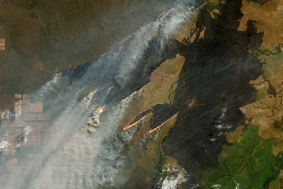В 2019 году наблюдалось резкое увеличение пожаров по всей Южной Америке, включая некоторые районы Амазонки. Всплески пожарной активности на большей части Южной Америки часто совпадает с сухим сезоном, который длится с июля по октябрь. В августе 2019 года спутник Landsat-8 запечатлел пожары вблизи границы Боливии, Парагвая и Бразилии.