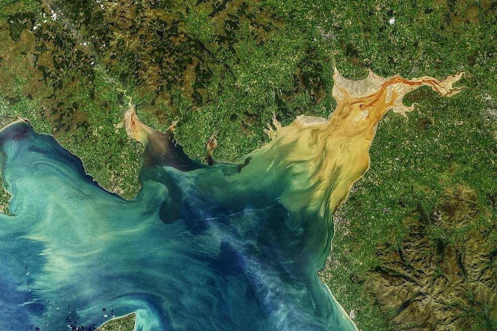 Солуэй-Ферт - залив Ирландского моря, который расположен у юго-западного побережья Шотландии. Landsat-8 сделал эту фотографию 2 октября 2019 года, когда воды вдоль побережья были богаты такими отложениями, как ил и песок. Приливы также, вероятно, перемешивали органические вещества - сухие растения, грунт и планктон. Вода резко изменила цвет у берега, где мелкий залив встречается с глубокими водами Ирландского моря. Подобные снимки могут помочь ученым больше узнать о том, как движение воды влияет на рост осадков и увеличение количества органики.
