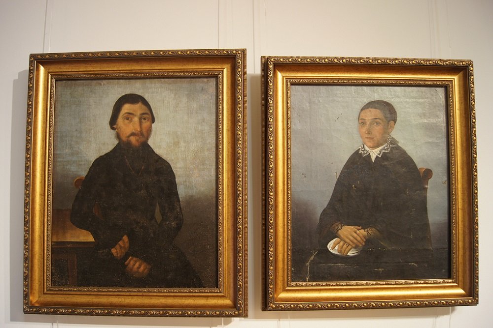 С картин в золоченых рамах смотрят представители известных купеческих династий города, общественные деятели и меценаты. Темный фон, минимум предметов, тщательно выписанные детали одежды, будь то почетный орден или вышивка на шали. Купчиха Фомина с семью нитками жемчуга на полной шее выглядит особенно монументально. Притягивают взгляд супруги Савиновы - румяный муж с настороженным взглядом, суровая жена (лицо - землистого цвета, как на потемневших образах).