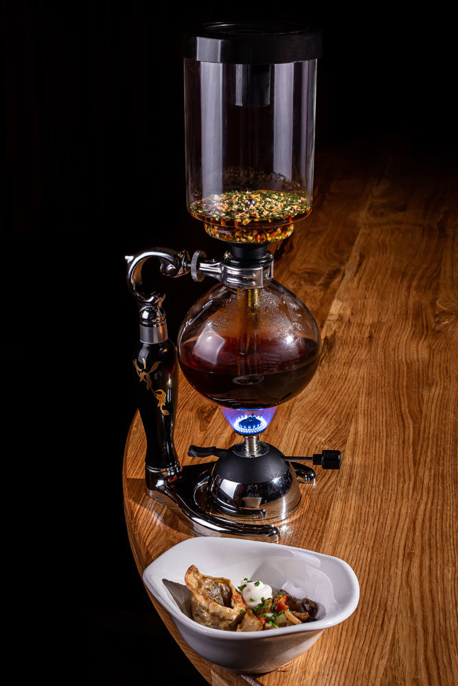 Некоторые блюда в сете уже знакомы постоянным гостям "Матрешки". Например, грибная похлебка. Делают ее не обычным способом. Перед столом ставят сифон, в основном используемый сегодня для альтернативного заваривания кофе, и при госте доводят бульон до готовности, насыщая ароматом сушеных овощей и трав. В качестве гарнира в тарелке с похлебкой подается "ушко", начиненное белыми грибами. Упоминание об этом постном пельмешке, который сначала запекают, а потом варят, можно найти еще в книгах начала XVII века.