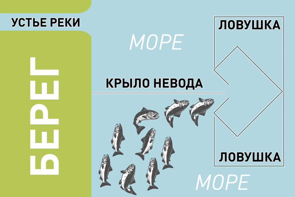 Владимир Смирнов: Это даст возможность лососю в большем объеме зайти в реки на нерест. Мы увеличим воспроизводство дикой рыбы, снизив промысловую нагрузку в море. Принцип добычи лосося в море прост. На нерест в поисках своей реки рыба идет вдоль береговой линии, где ее поджидают ставные невода. Пытаясь их обойти, она попадает в ловушки.