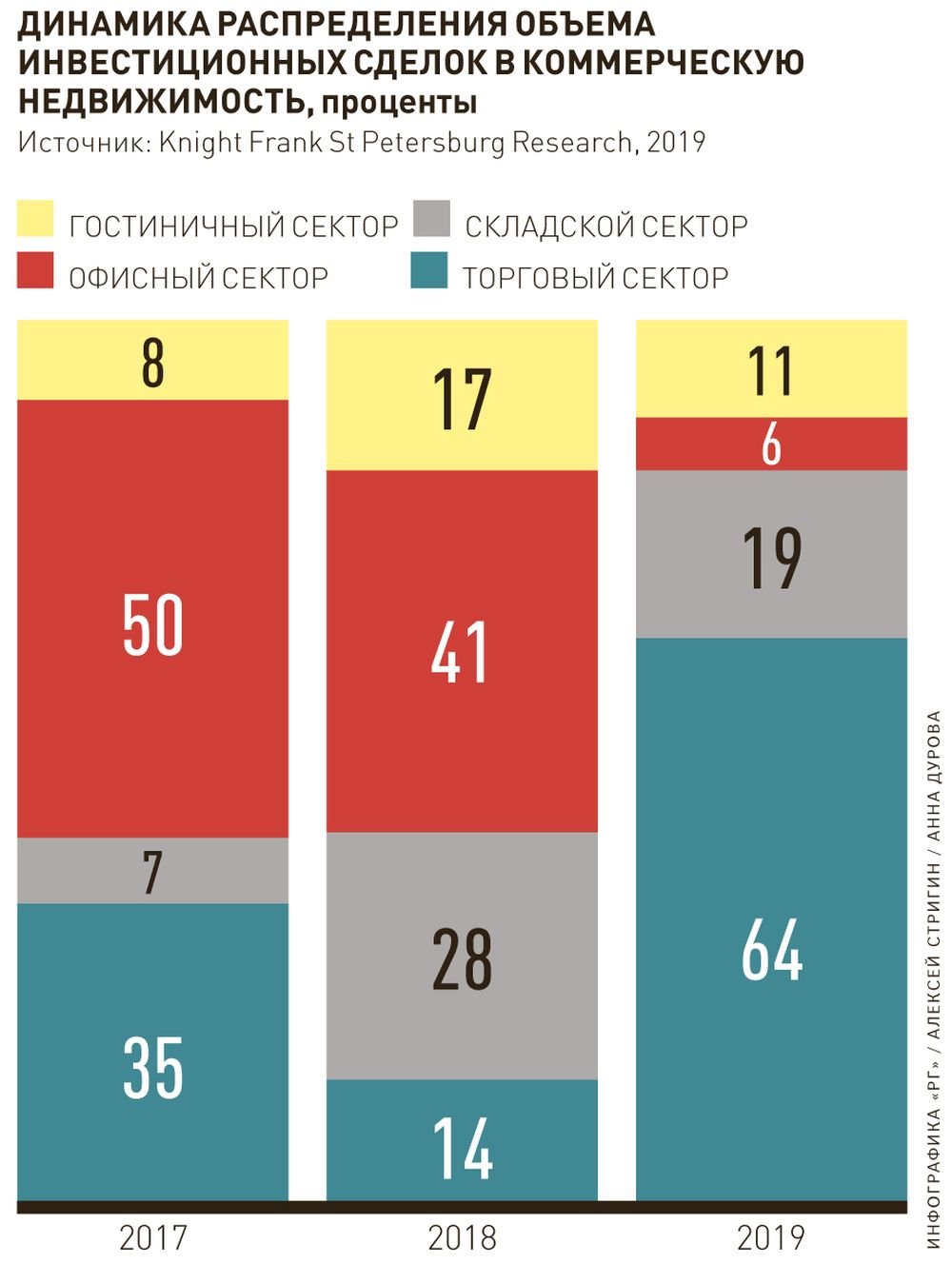 При этом, отмечают исследователи, за последний год в сегменте коммерческой недвижимости было реализовано в четыре раза больше объектов (в денежном выражении), в то время как в сегменте участков под строительства жилья, наоборот, отмечено снижение на 58 процентов. Таким образом, 85 процентов всех сделок - это договоры в сфере коммерческой недвижимости. По мнению экспертов, этому способствовали укрепление курса рубля и снижение ключевой ставки, а также тренд на увеличение числа сделок с торговой недвижимостью. В 2019-м инвестиционная активность на складском рынке (64 процента от всех сделок)увеличилась в три раза, поставив исторический рекорд - 161,2 тысячи квадратных метров площадей.