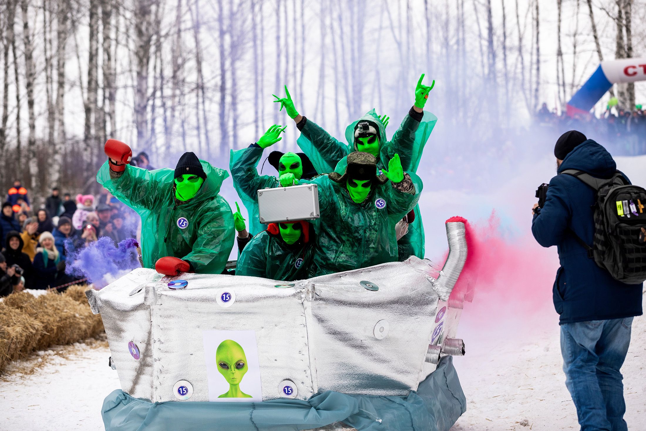 Центральное событие - заезды на самодельных санях, - развернулось на самой крутой горке. В прошлом году экипажи нередко теряли управление и норовили въехать в зрителей. На этот раз болельщиков защитили барьерами из тюков с сеном. Кроме того на трассе, как на "Формуле 1" дежурили маршалы, возвращавшие сани на правильную дорогу. На конкурс заявилось 26 экипажей: от сравнительно простых саней в виде лебедя до НЛО на воздушной подушке. Шесть камер от "Газели" соединили вместе, получилась мегаплюшка. Экипаж - развеселые студенты в зеленых нарядах и масках пришельцев, - заявили, что прилетели с планеты Тамбов-2, чтобы поразвлечься.