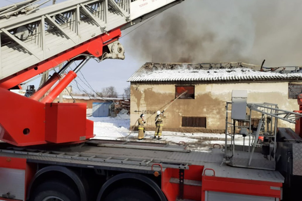 В Оренбурге потушен крупный пожар на продовольственном складе: площадь возгорания составила 1000 квадратных метров. Жертв и пострадавших нет.