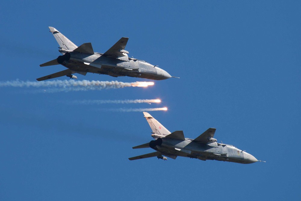 Плановые бомбовые удары по наземным целям на полигоне в Калининградской области выполняют экипажи многоцелевых истребителей Су-30СМ и бомбардировщиков Су-24М морской авиации Балтийского флота.