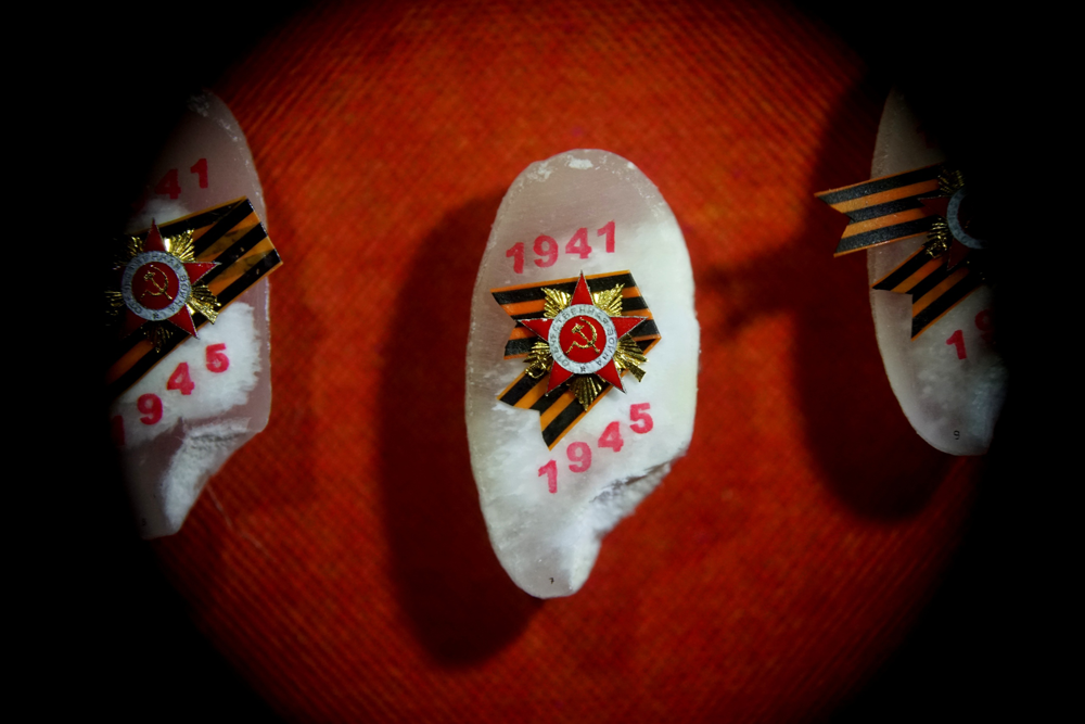 Каждая копия Ордена Победы расположена на георгиевской ленте, которая, в свою очередь, помещается на срезе рисового зернышка. Таким образом размеры самой награды не превышают 2 миллиметров. Две копии Знамени Победы созданы из микрочастиц нитки, снятой с официальной копии легендарного символа, развевавшегося над рейхстагом. Третья копия - краска на золотой пластинке.