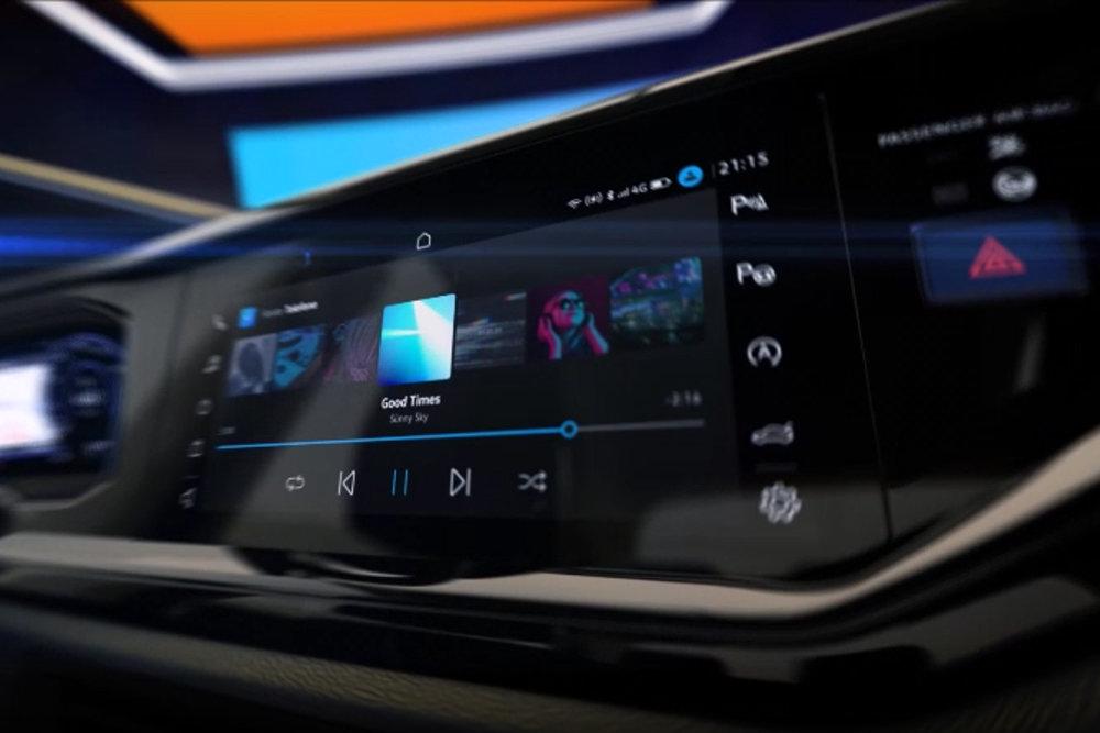 Несмотря на то, что всё показывается довольно динамично и без фокуса на общем плане, заметно, что концепция торпедо такая же, как у Volkswagen Polo. Отличается лишь мультимедийная система: у Nivus в отличие от Polo она не имеет физических органов управления.