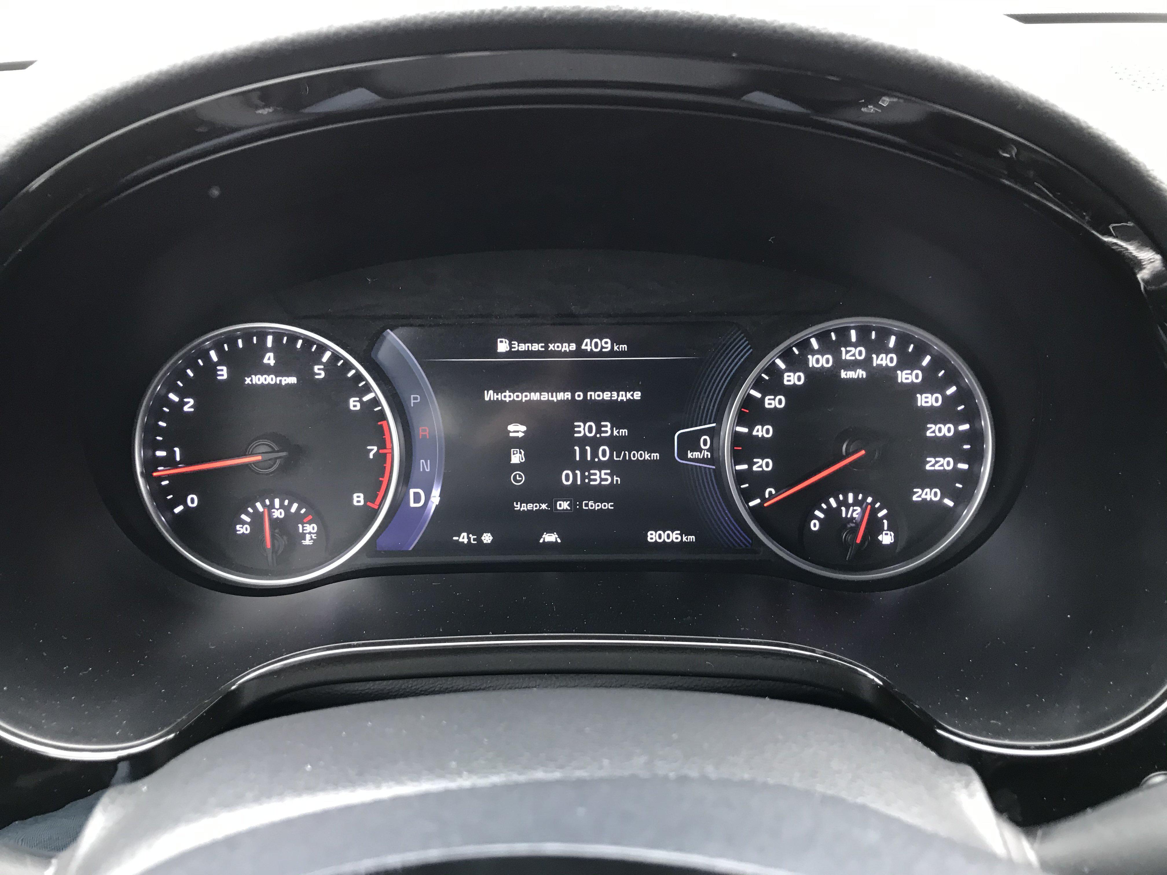На приборной панели - крупные циферблаты и семидюймовый дисплей между ними с большим количеством параметров. Читается все это образцово. Единственный минус - скорость дублируется цифрами в правом "ухе" - не всем такой подход понравится. Но в нашем "нафаршированном" Seltos туда можно и не смотреть - благо есть выдвижной проекционный экранчик, на котором отображаются дорожные ограничения, текущая скорость, радиостанция и навигация.