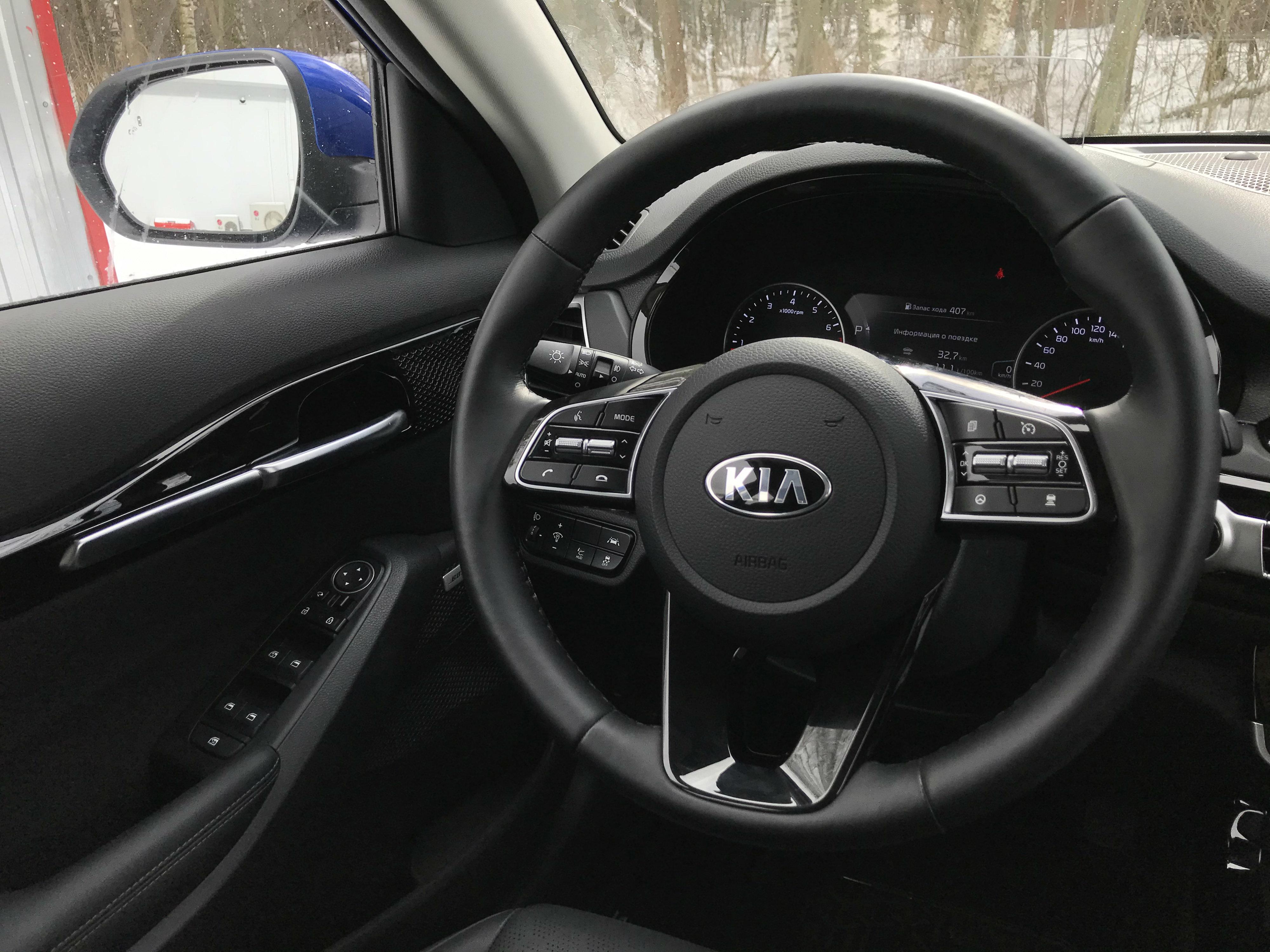 Здесь пухлая и приятная "баранка", современный мультимедийный комплекс с 10-дюймовым экраном (как у Soul и Sonata), аудиосистема Bose, настраиваемая подсветка салона, удобная посадка (руль регулируется в двух плоскостях).