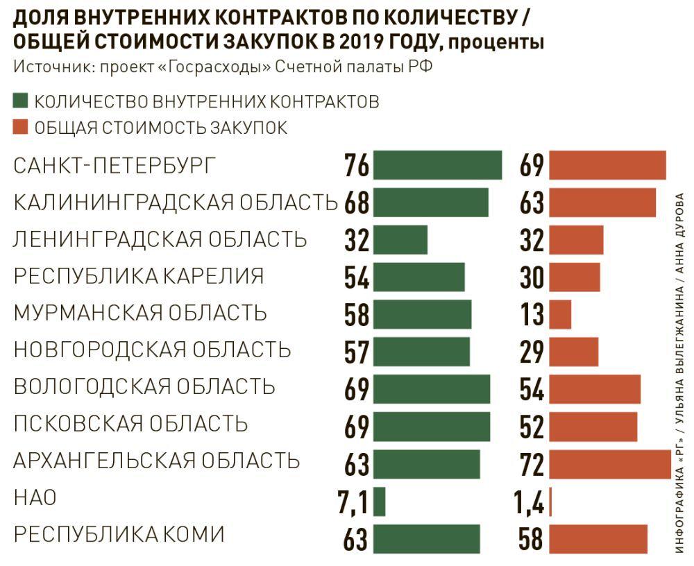 Что касается Ленобласти и НАО, продемонстрировавших самую низкую в стране долю контрактов, переданных местным поставщикам, ситуация объясняется географическим положением этих субъектов РФ. В Ленобласти более половины закупок выиграли поставщики из Петербурга, в НАО - из Архангельской области, в состав которой входит округ.