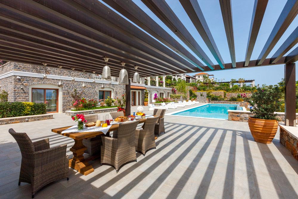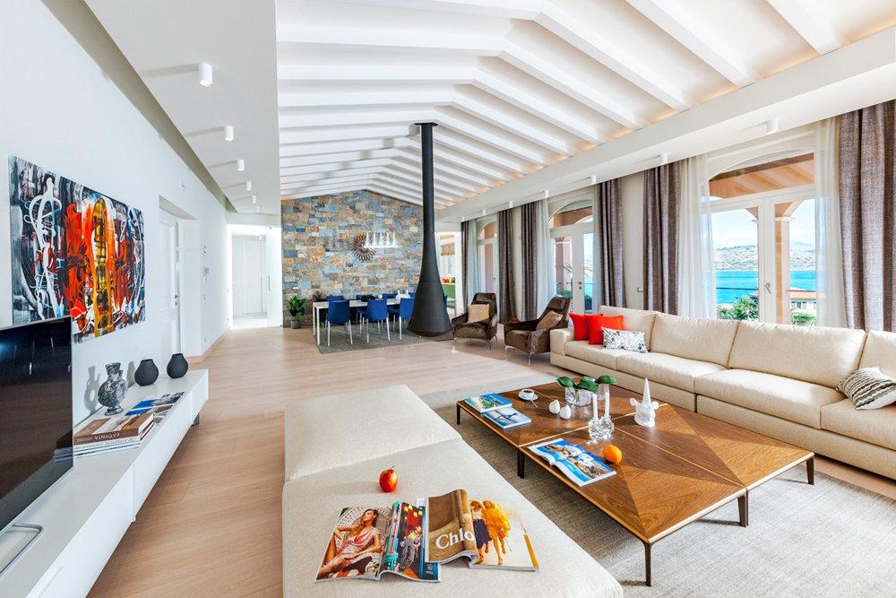 Площадь первой виллы Mirum Elounda Villas, которая называется The One, составляет более 600 квадратных метров. В ней пять спален, просторная гостиная, столовая на 10 персон и кухня. Из всех помещений есть выход на террасу.