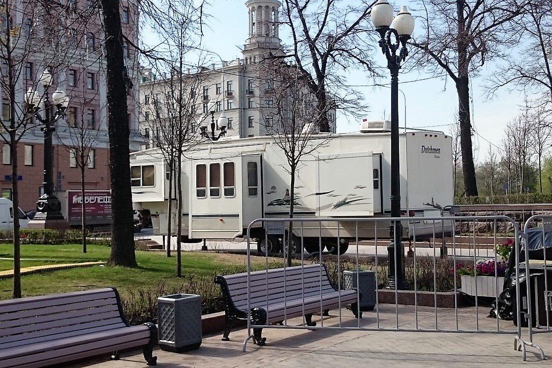 Трейлер, в котором есть сразу три отдельных входа, появился в столице в разгар периода самоизоляции. Однако вряд ли его используют как временное жилье. "Штатная" функция такого помещения - служить кинематографистам или организаторам массовых мероприятий.