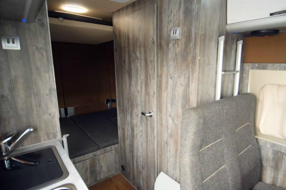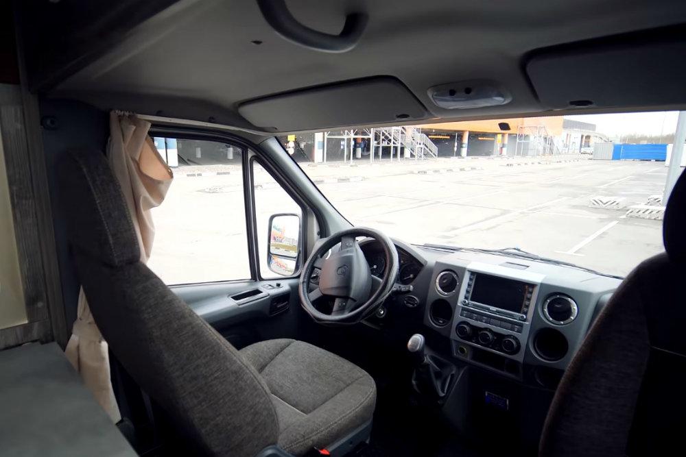 Внутри автомобиля можно стоять в полный рост, а сиденья водителя и пассажира способны поворачиваться. Внутреннее убранство изготовлено качественно и аккуратно. В состав автодома входит компактная кухня, обеденная зона со съёмным столиком и креслами, санузел с душем, комната на четыре спальных места. Дополнительно установлен кондиционер и отопитель на всю машину, а также инвертор на 220В.