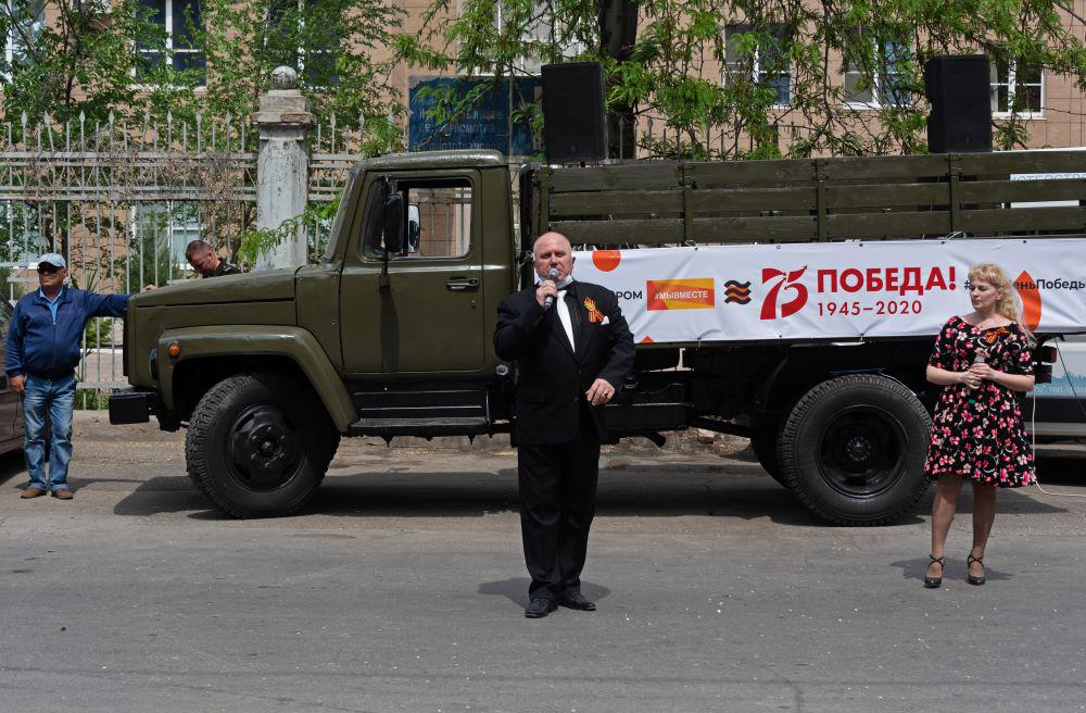Астраханские артисты на стилизованном грузовике, который стал одним из символов военного времени, сегодня начали объезжать дома, где живут участники Великой Отечественной войны и выступать с концертами в их дворах.