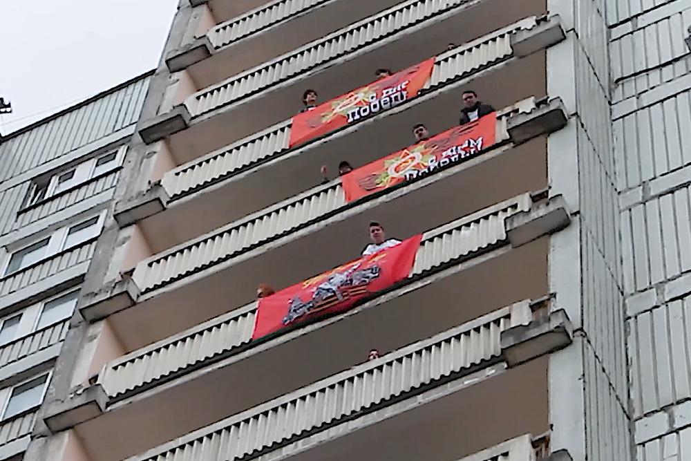 При этом на балконах вывесили флаги Победы, а слова песен разучивали в групповом чате дома.