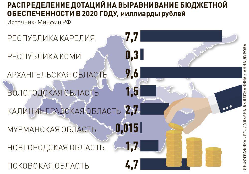 В СЗФО дотационными являются все регионы, кроме Санкт-Петербурга, Ленинградской области и НАО.?Однако уровень финансовой зависимости реципиентов от федерального центра разнится. К примеру, в Мурманской области объем дотаций составил в текущем году порядка 15 миллионов рублей - это лишь сотые доли процента от всех доходов регионального бюджета. В Псковской области на федеральные дотации приходится более 13 процентов доходов казны - 4,7 миллиарда рублей из 35 миллиардов.