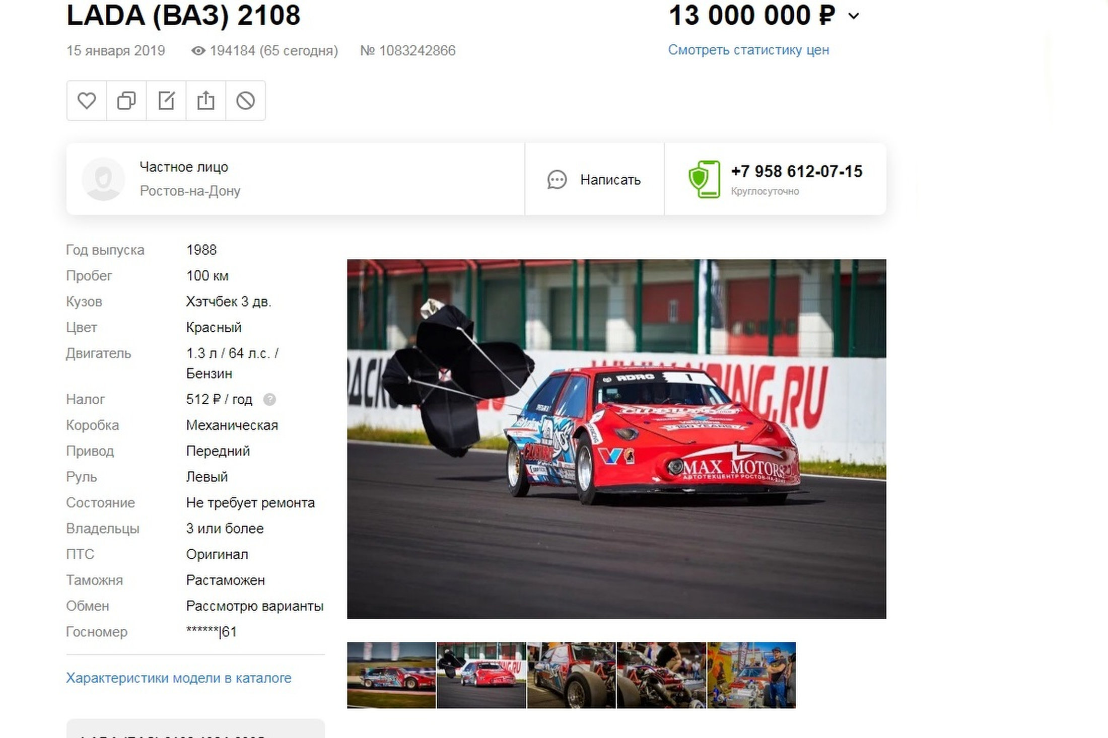 В Ростове-на-Дону продается "Восьмерка" 1988 года по цене нового Mercedes AMG. Собственно, от ВАЗ-2108 в машине (и то не полностью) остался только кузов. Проект является ничем иным как болидом для участия в чемпионате России по дрэг-рейсингу, то есть, скоростных заездах по прямой на 402 метра, и принадлежит обладателю Кубка России из команды Clubturbo Владимиру Третьяку.