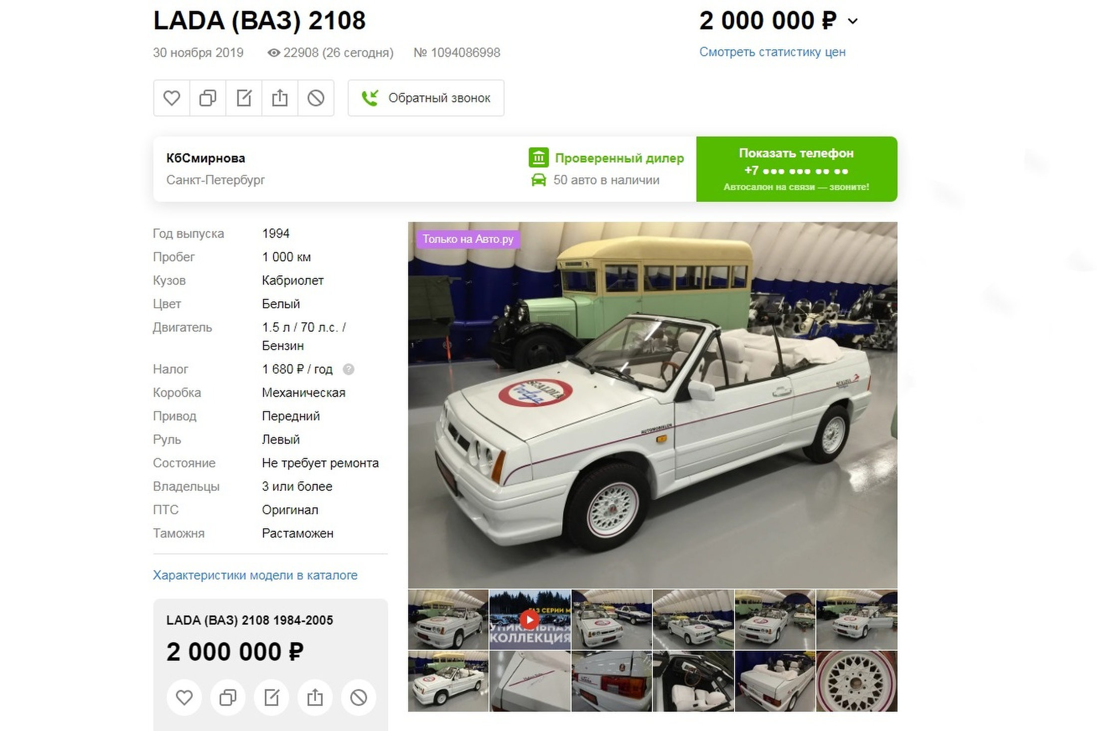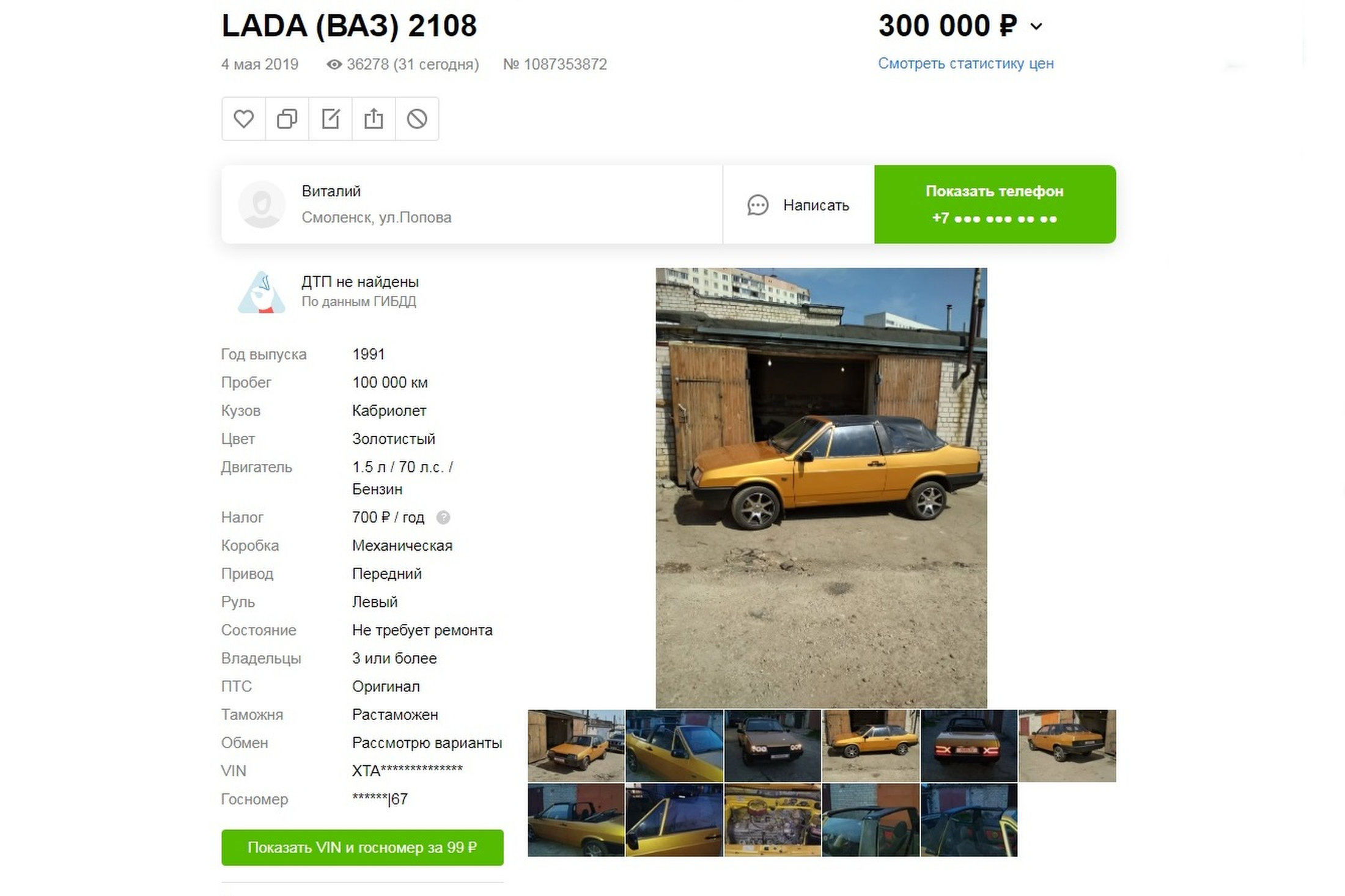 Предлагаемая версия 1991 года выпуска с двигателем 1.5 мощностью 70 л.с. Заявленный пробег - 100 000 км, что может быть правдой, поскольку даже вазовские кабриолеты в России покупались как диковинки и часто не эксплуатировались. По этой же причине быстро надоедали, так что чаще всего в ПТС большое число владельцев.