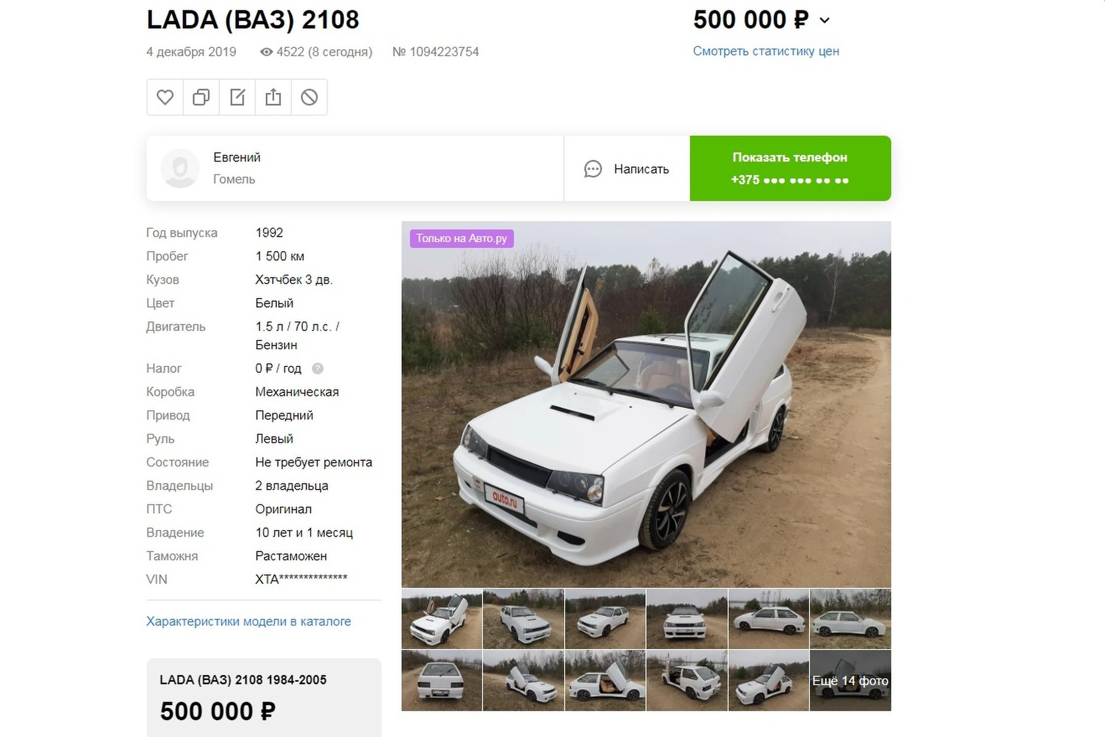Евгений из белорусского города Гомель, видимо отчаявшись продать машину на родине, выставил на российских ресурсах интересный тюнинговый проект на базе ВАЗ-2108 1992 года выпуска. Подход к созданию схож с "Турбовосьмеркой", описанной выше: автомобиль подвергся масштабной переделке, которая коснулась буквально всей конструкции.