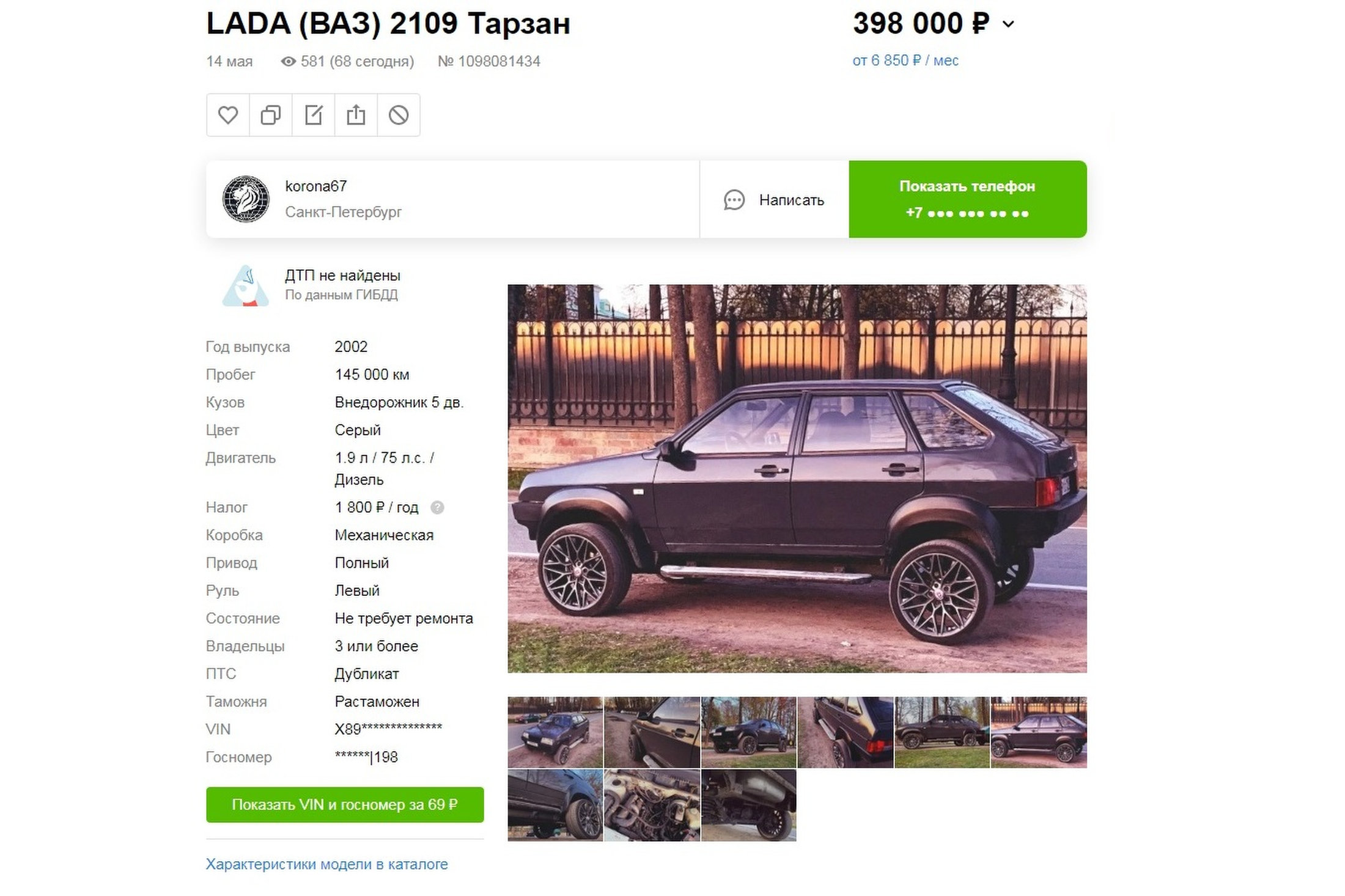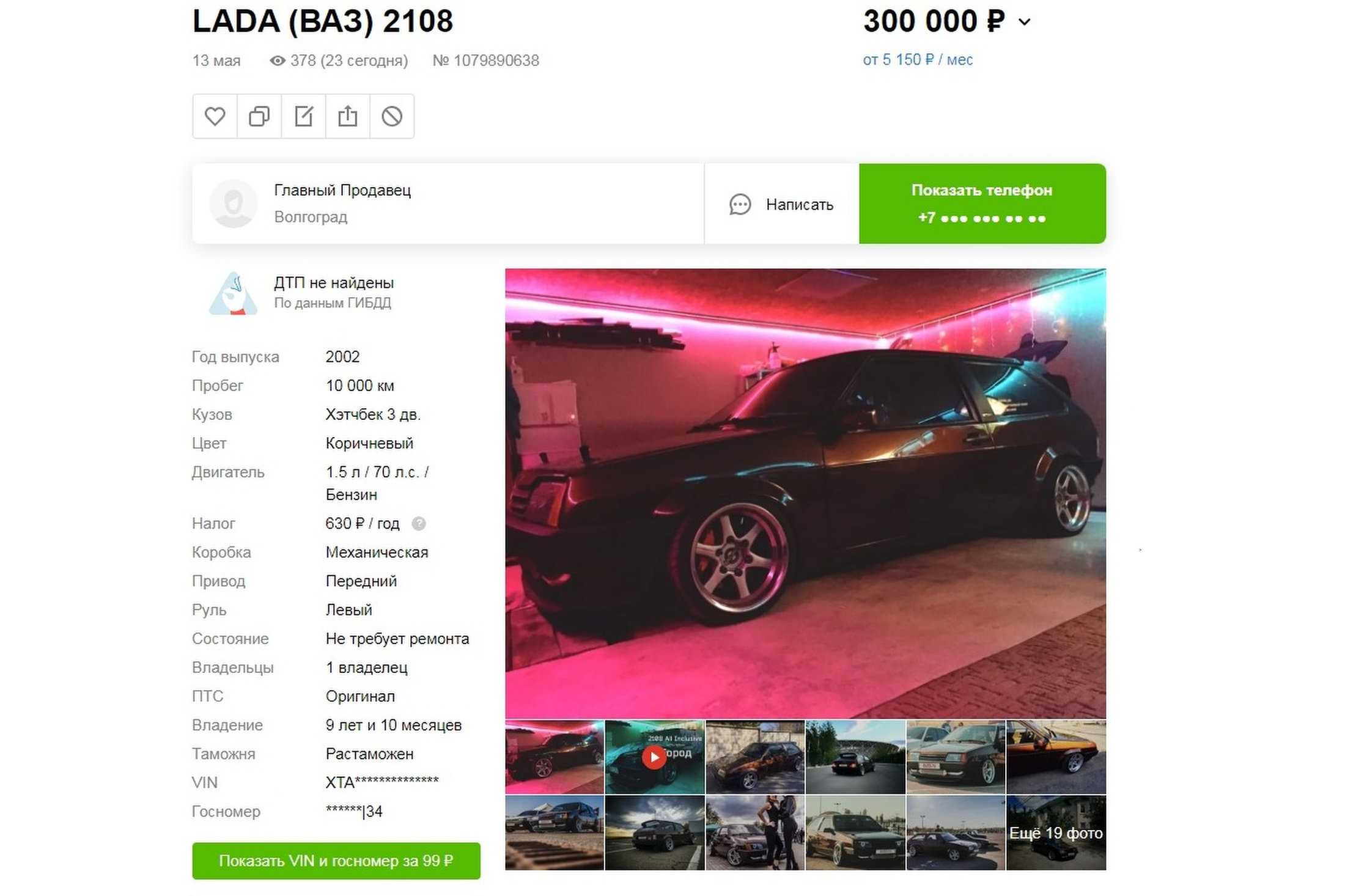 К сожалению, никакого описания и истории к машине нет, но видны следы легкого тюнинга вроде замены оптики и дисков. Система сайта объявлений выдает предупреждение о неких юридических ограничениях.
