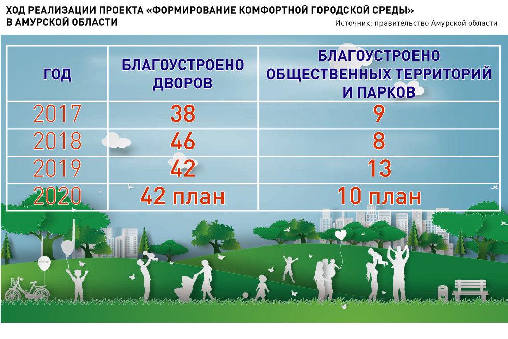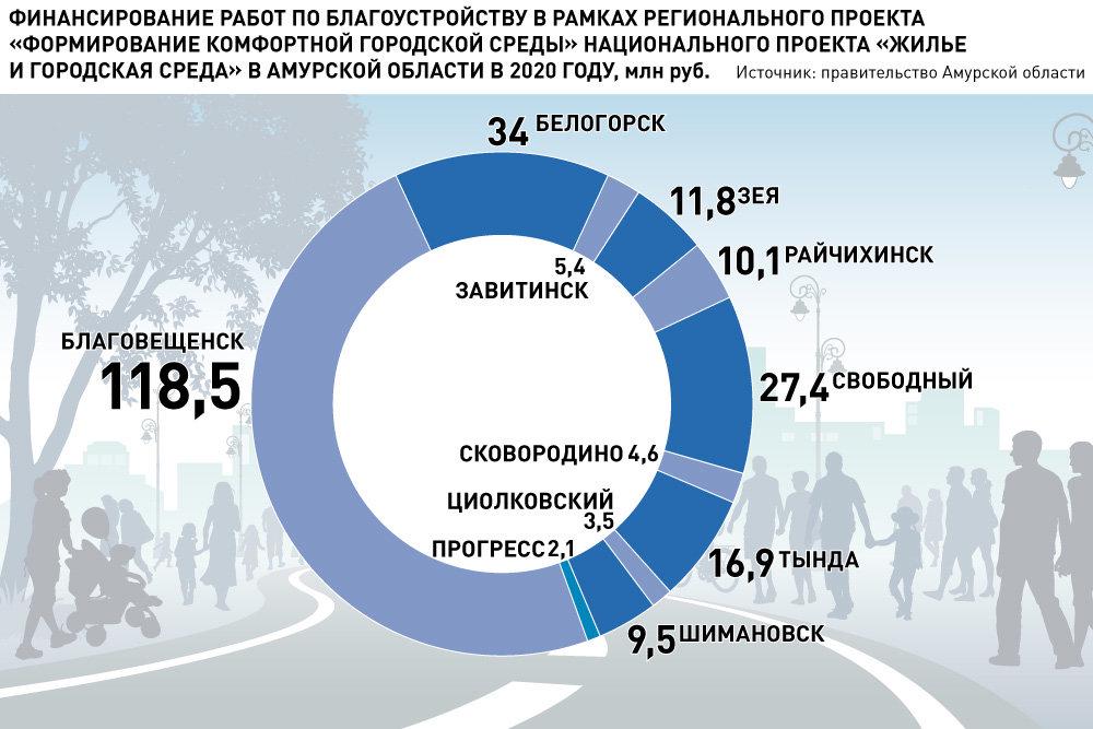 В 2020 году по нацпроекту запланированы работы в 42 дворах и десяти общественных местах в Благовещенске, Белогорске, Завитинске, Зее, Свободном, Сковородине, Райчихинске, Тынде, Шимановске, ЗАТО Циолковском и поселке городского типа Прогресс. На благоустройство направят 243,8 миллиона рублей.