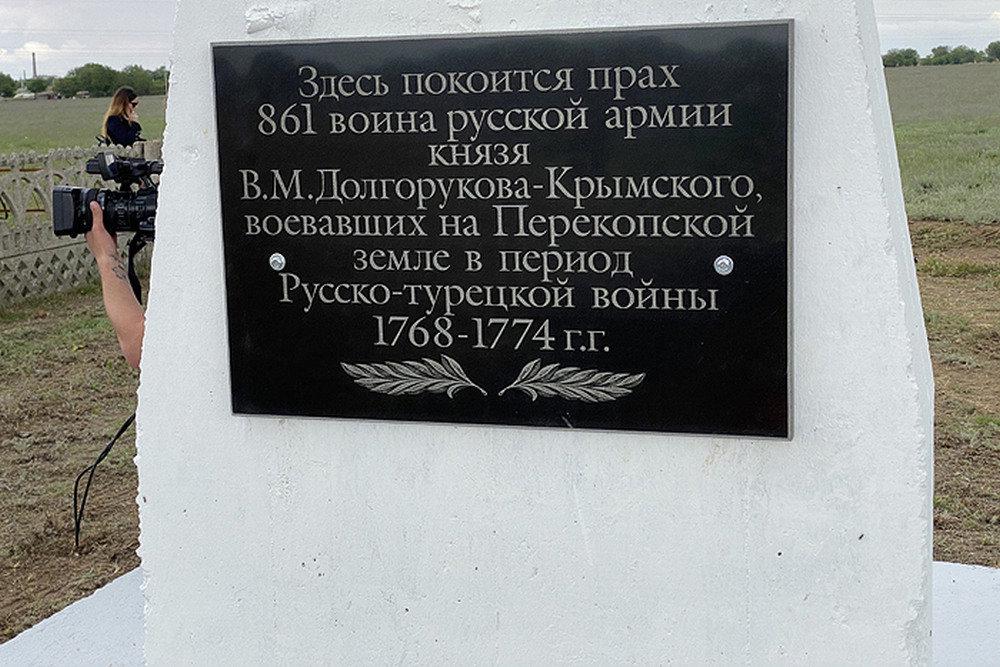 Останки солдат и офицеров предали земле по православной традиции, установив на месте захоронения памятник - крест с надписью: "Здесь покоится прах 861 воина русской армии князя В.М. Долгорукова-Крымского, воевавших на Перекопской земле в период Русско-турецкой войны 1768-1774 г.г.". Место погребения теперь будет воинским мемориалом. Предположительно здесь захоронены воины подразделения, которым командовал генерал-поручик Максим Васильевич Берг.