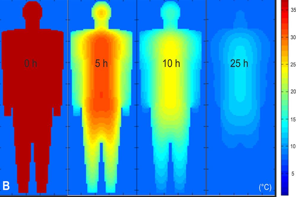 Морис Алдерс и его коллеги из института судебной медицины контактными термометрами определяли температуру кожи лба, груди, живота и бедер четырех тел мужчин и женщин от 60 до 94 лет, которые находились в морге (при жизни умершие согласились пожертвовать свои тела науке после смерти). Измерения проводили с пяти до 50 часов после гибели доноров.