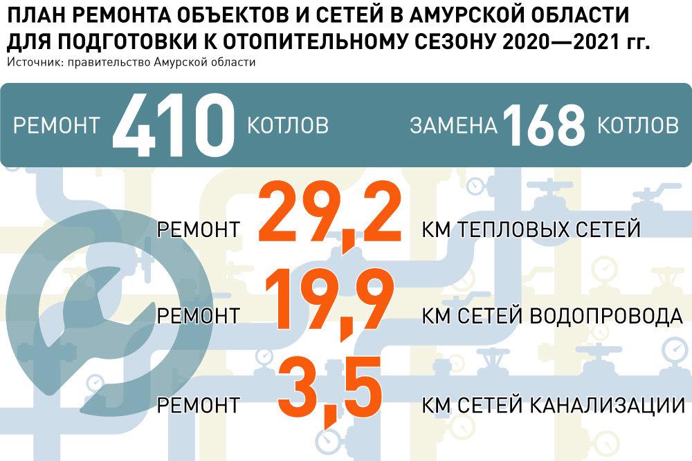 В области уже развернулась подготовка к следующему осенне-зимнему сезону. Для обеспечения надежной и бесперебойной подачи тепла в дома амурчан намечена обширная ремонтная программа. Всего в регионе планируется заменить 168 и отремонтировать 410 котлов, привести в нормативное состояние почти по 20 километров тепловых и водопроводных труб, 3,5 километра сетей канализации.