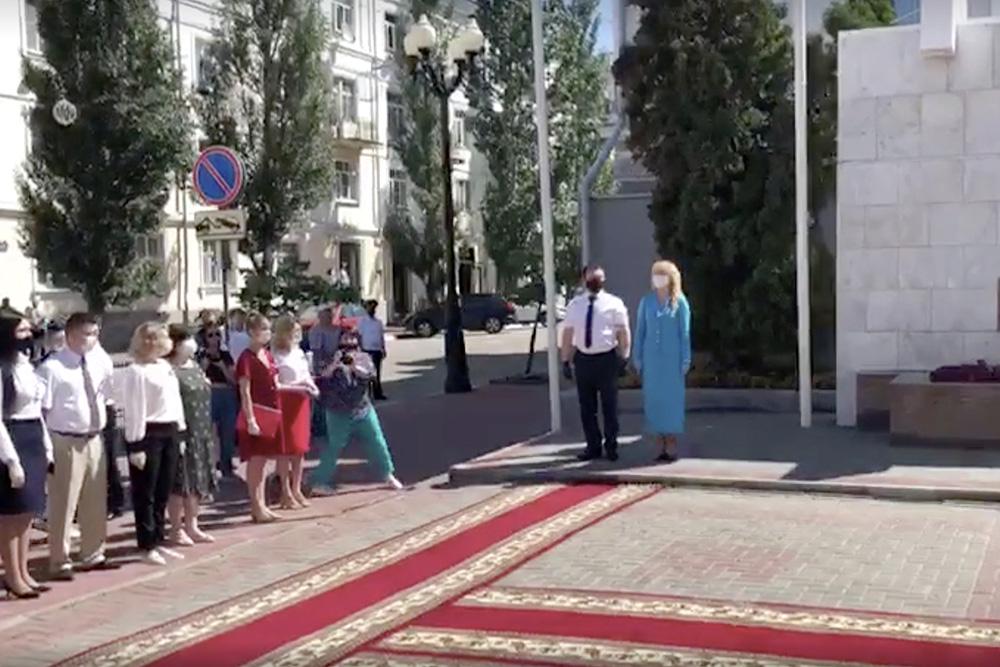 Нынешний праздник получился камерным - самоизоляцию пока никто не отменял, - и прошел на площадке у городской доски почета рядом с мэрией. Флаги РФ и Тамбова подняли с соблюдением социальной дистанции и масочного режима. Солистам ансамбля "Новый мир" на время исполнения гимна маски разрешили снять - иначе бы песни не вышло.