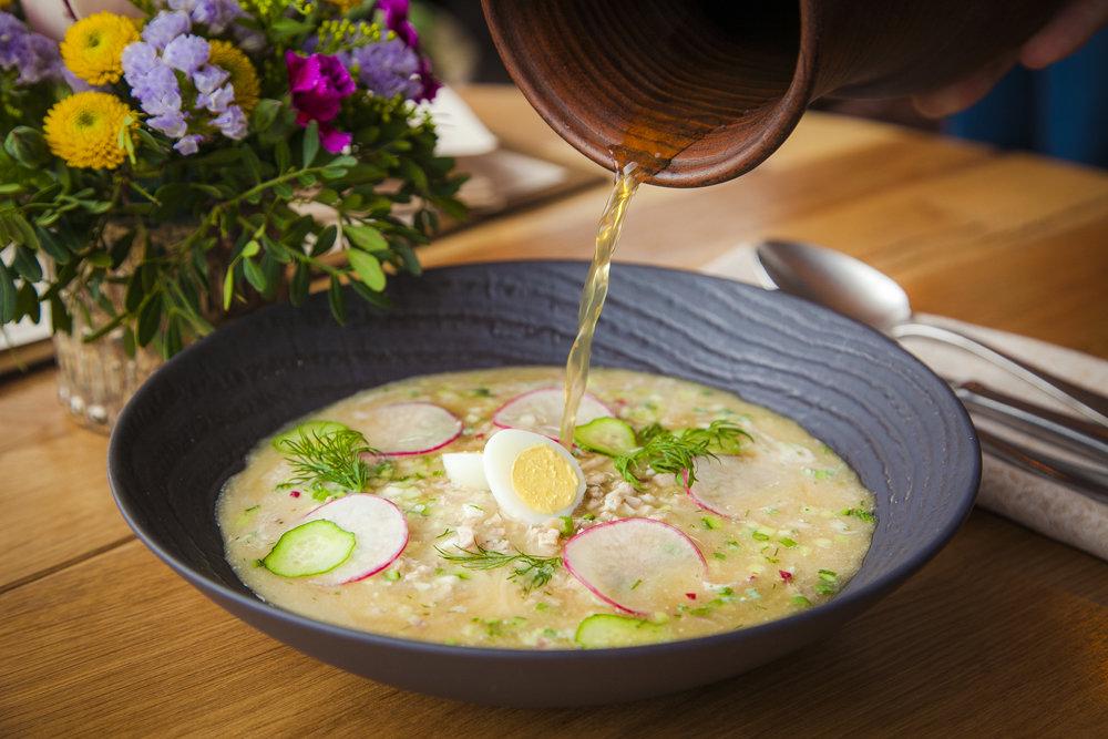 Вид на Кремль, Исторический музей и коллекцию освежающих летних супов приготовил ресторан Peshi. Гаспачо с сорбетом из огурца, сельдерея и лимона в трех версиях (с крабом, креветками или вегетарианский), холодный суп из ревеня с яйцом пашот, свекольник с мороженым из хрена и снегом из укропа, окрошка на квасе или айране - лето здесь не будет жарким.