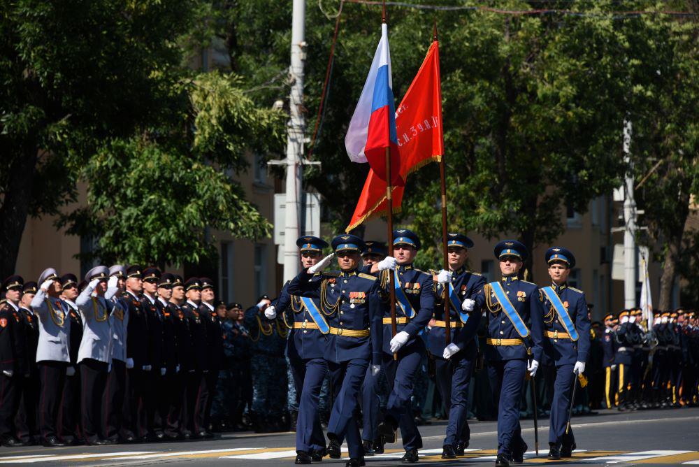 Победным маршем по площади имени Ленина прошли 800 военнослужащих - сотрудники Росгвардии, Центра боевого применения и боевой подготовки воздушно-космических сил России, казачьего войска Донского, астраханской таможни, территориальных управлений служб судебных приставов и исполнения наказаний, спасательных и силовых ведомств.