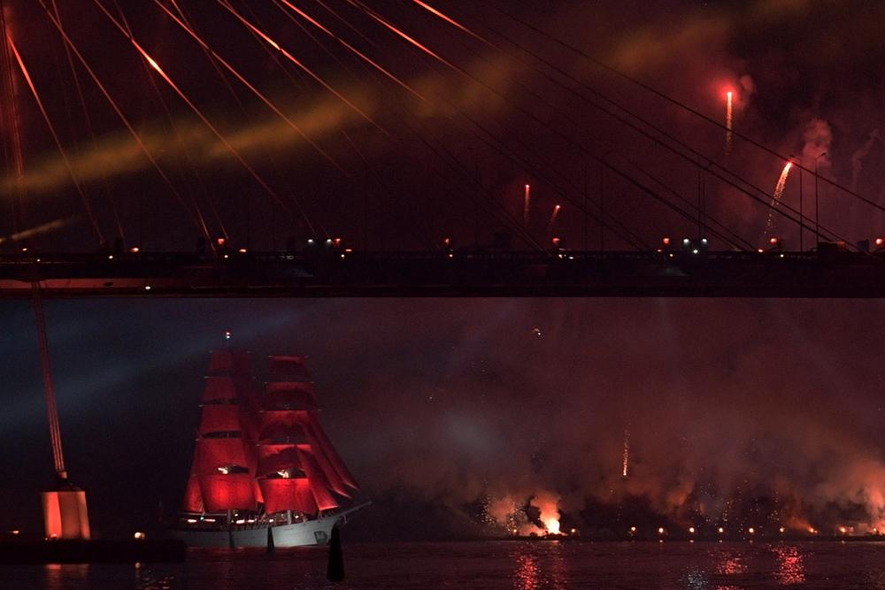 Праздник выпускников "Алые паруса" традиционно проводился в центре Северной столицы. Бриг торжественно проходил мимо Дворцовой набережной и Стрелки Васильевского острова. Здесь же был салют.