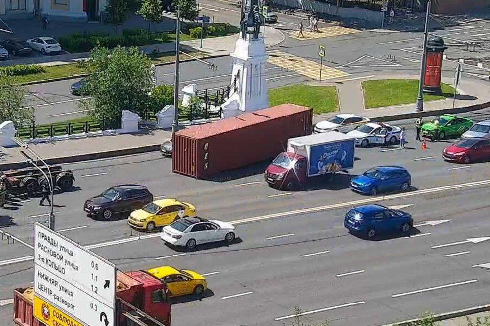Как сообщает пресс-служба департамента транспорта, на Тверском путепроводе у грузовика оторвался контейнер.