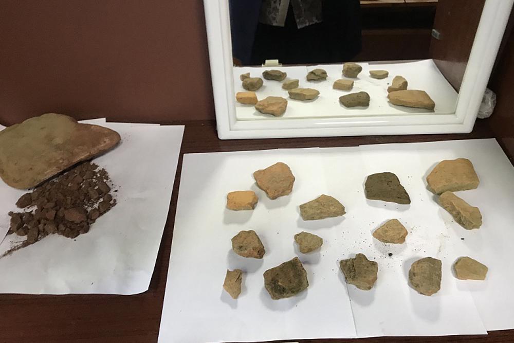 Сотрудники центра на глубине 12-30 сантиметров заметили нетипичный для зональной почвы минеральный горизонт. Он имел нехарактерную красновато-охристую окраску и представлял собой горизонтальную кладку обломков аргиллитов пластинчато-слоистой формы со следами обжига.