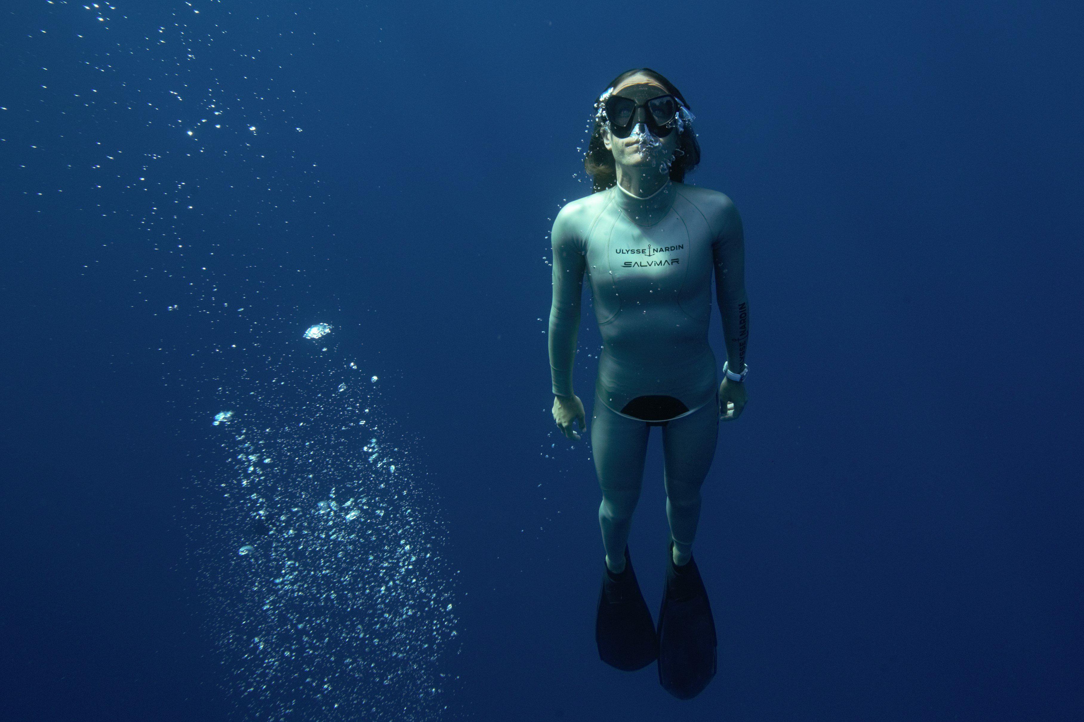 О четвертой модели, выпущенной лимитированной серией, стоит рассказать отдельно. Дело в том, что новую коллекцию Lady Diver компания Ulysse Nardin представила вместе с Алессией Зеккини, 27-летней итальянской чемпионкой по фридайвингу и обладательницей мирового рекорда по задержке дыхания. Это первая женщина в команде друзей бренда, и она разделяет дух Ulysse Nardin - дух искателей приключений.