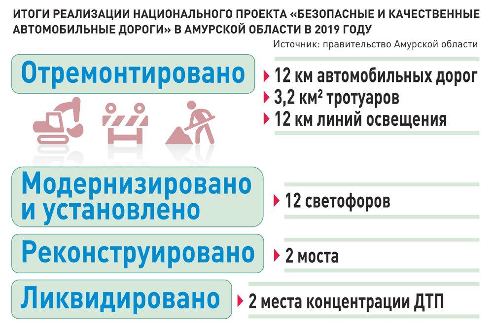 В 2020 году намечены работы на 20 объектах: 16 - в Благовещенской агломерации и 4 - на региональной дорожной сети. Всего в планах - ремонт 20,3 километра дорог, а также реконструкция 2,3 километра трасс и двух мостовых переходов общей протяженностью 1,4 километра.