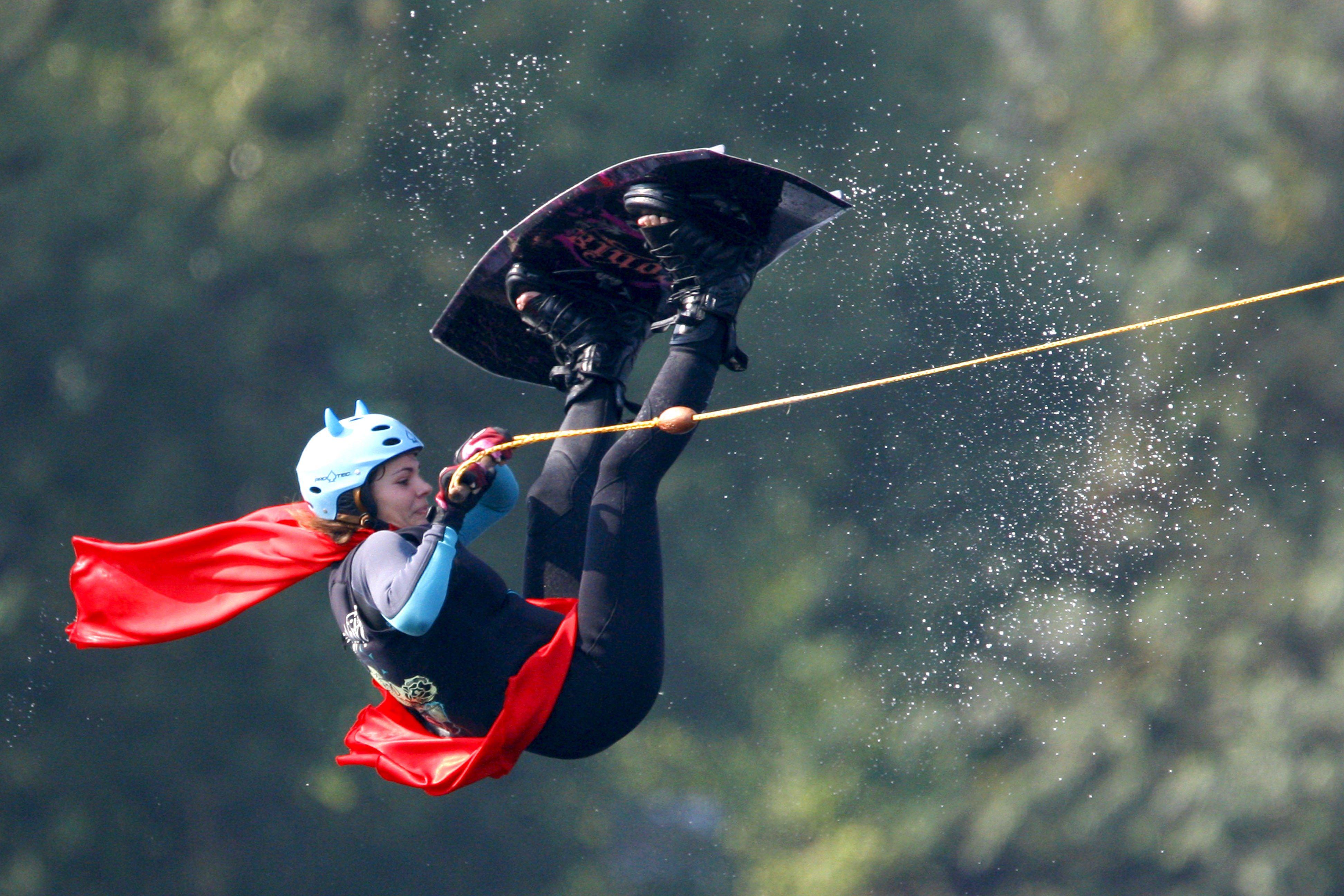 Флайбординг - это тоже полеты на доске, только в высоту. Эта доска работает от гидроцикла, которым управляет инструктор. Катающийся надевает гидрокостюм и шлем, "обувает" доску и ложится на воду. Когда гидроцикл заводится, реактивная тяга поднимает доску с человеком вверх. "Полететь можно уже через несколько минут после начала инструктажа", - утверждает Лукашов. Причем в данном случае чем больше весит человек на доске, тем ему легче дается обучение. Слишком худосочных людей в прямом смысле слова сносит ветром, который образуют потоки воды под доской.