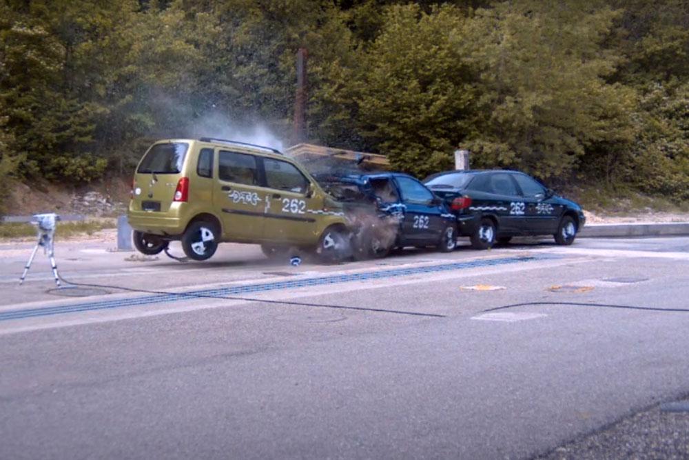 Швейцарская компания, изучающая безопасность транспортных средств - Dynamic Test Center - показала, что происходит при ударе сразу нескольких припаркованных машин, в которые врезалась летящая на скорости 92,4 км/ч Opel Agila. У "виновника" ДТП на крыше дополнительно были закреплены листы дерева: авторы теста хотели проверить, насколько опасно столкновение с грузом на крыше.