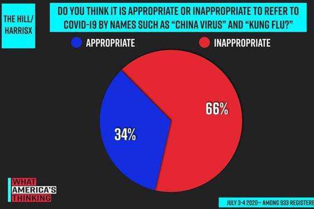 Опрос проводился 3-4 июля, в нем приняли участие 933 избирателя. Результаты опроса показали, что 83 процента сторонников демократов и 66 процентов беспартийных респондентов говорят о неуместности использования вышеупомянутых определений при обсуждении тем о новом коронавирусе. 56 процентов сторонников Республиканской партии считают эти определения Трампа подходящими.