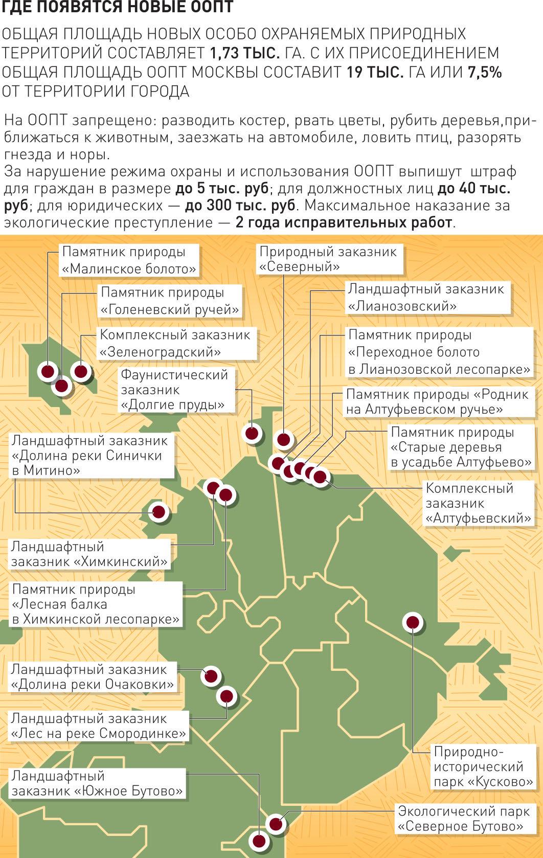 По его словам, в столице до недавнего времени было 17 тысяч га территорий с особым охранным статусом. На них обитают 569 видов растений и животных, занесенных в Красную книгу Москвы. Вновь присоединенные природные парки добавили к ООПТ еще 1,73 тыс. га. Таким образом, сегодня в Москве под особую охрану взято 140 природных территорий общей площадью 19 тыс. га. Это 7,5% территории города. "И прежде чем попасть под охрану, ООПТ прошли тщательную проверку - на уникальность, наличие требующей охраны флоры и фауны, соседство с магистралями и жилыми домами, которые могут нанести им вред. По закону на ООПТ не допускаются любые действия, которые могут причинить вред природным объектам и обитателям, - рассказывает Кульбачевский. - Например, запрещен въезд транспорта без спецразрешения, нельзя уничтожать и срывать растения, беспокоить животных, наносить урон природе, замусоривать территорию, сажать или рубить деревья, разводить костры, сжигать сухие листья и траву, ставить торговые палатки без нашего разрешения и многое другое. За нарушение этих правил, прописанных в законе Москвы "Об особо охраняемых природных территориях", налагается штраф в размере от 4 до 300 тысяч рублей".
