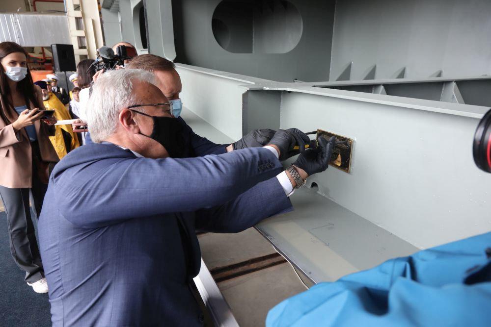 В завершение церемонии главы двух регионов закрепили памятную доску, символизирующую начало строительства теплохода.